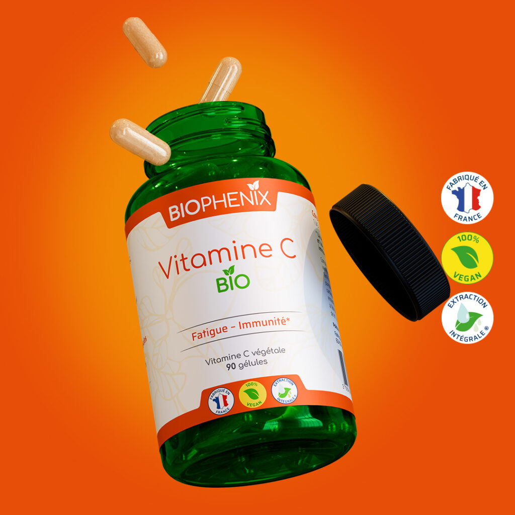 La vitamine C de Biophénix est issue exclusivement de sources végétales biologiques, riches en biofalavonoïdes naturels et reliée à sa matrice végétale (fibres et protéines du végétal) pour une assimilation optimale sans acidité.